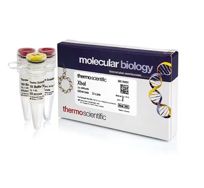 XhoI – ER0691 restriction enzyme recognizes C^TCGAG sites and cuts best at 37°C in R buffer. See Reaction Conditions for Restriction Enzymes for a table of enzyme activity, conditions for double digestion, and heat inactivation for this and other restriction enzymes. Note: Also available as a FastDigest enzyme for rapid DNA digestion. Isoschizomers: PaeR7I, Sfr274I, SlaI, StrI, TliI.