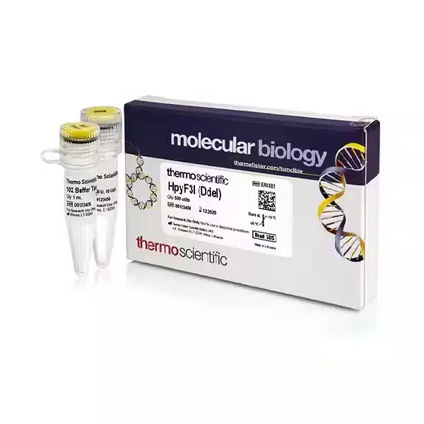Thermo Scientific HpyF3I (DdeI) (10 U/µL) -ER1881 restriction enzyme recognizes C^TNAG sites and cuts best at 37°C in Tango buffer. See Reaction Conditions for Restriction Enzymes for a table of enzyme activity, conditions for double digestion, and heat inactivation for this and other restriction enzymes. Note: Also available as a FastDigest enzyme for rapid DNA digestion. Isoschizomers: BstDEI, DdeI.