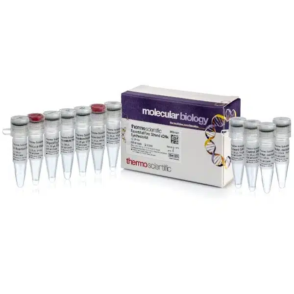 Thermo Scientific RevertAid First Strand cDNA Synthesis Kit is a complete system for efficient synthesis of first strand cDNA from RNA templates. The kit uses RevertAid Reverse Transcriptase (RT), a recombinant M-MuLV RT which maintains activity at 42-50°C and is suitable for synthesis of cDNA up to 13 kb. RiboLock RNase Inhibitor, supplied with the kit, effectively protects RNA templates from degradation.